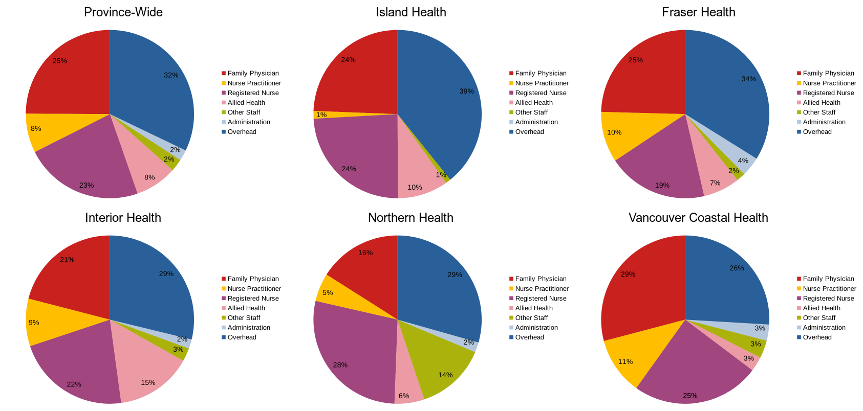 Expenditures were broken down into seven categories: family physicians, nurse practitioners, registered nurses, allied health (e.g., counsellors), other clinical staff, administrative staff (e.g. clerks, directors, coordinators), and overhead (all non-salary expenses, e.g. equipment, lease, repairs, utilities).