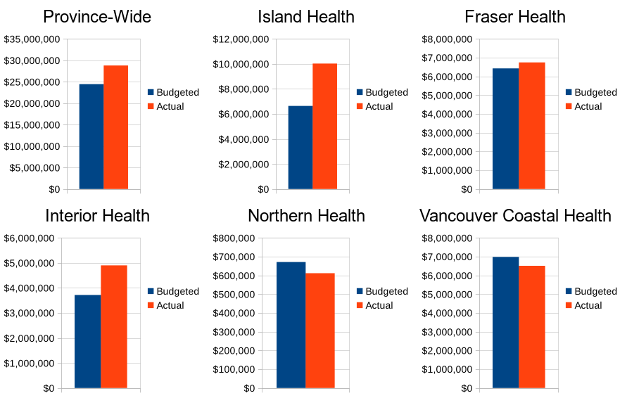 As with other areas, Island Health is the worst offender when it comes to exceeding its overhead budget by over 50% ($3.4 million over its $6.6 million budget), whereas some (Northern Health and Vancouver Coastal Health) ran under budget. Curiously, the oldest UPCC, Westshore, more than doubled its expected overhead. One would have hoped they'd learned to properly budget after all this time.