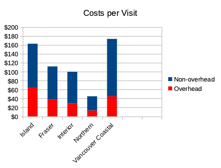 Administration and Overhead. It also tells us how much they're spending on non-clinical tasks (administration and overhead). In general, we want to see most money going to clinical staff. Again, there are big differences, e.g., VCH is doing well, Island Health's UPCCs have a much higher than average overhead. The reasons why aren't clear.